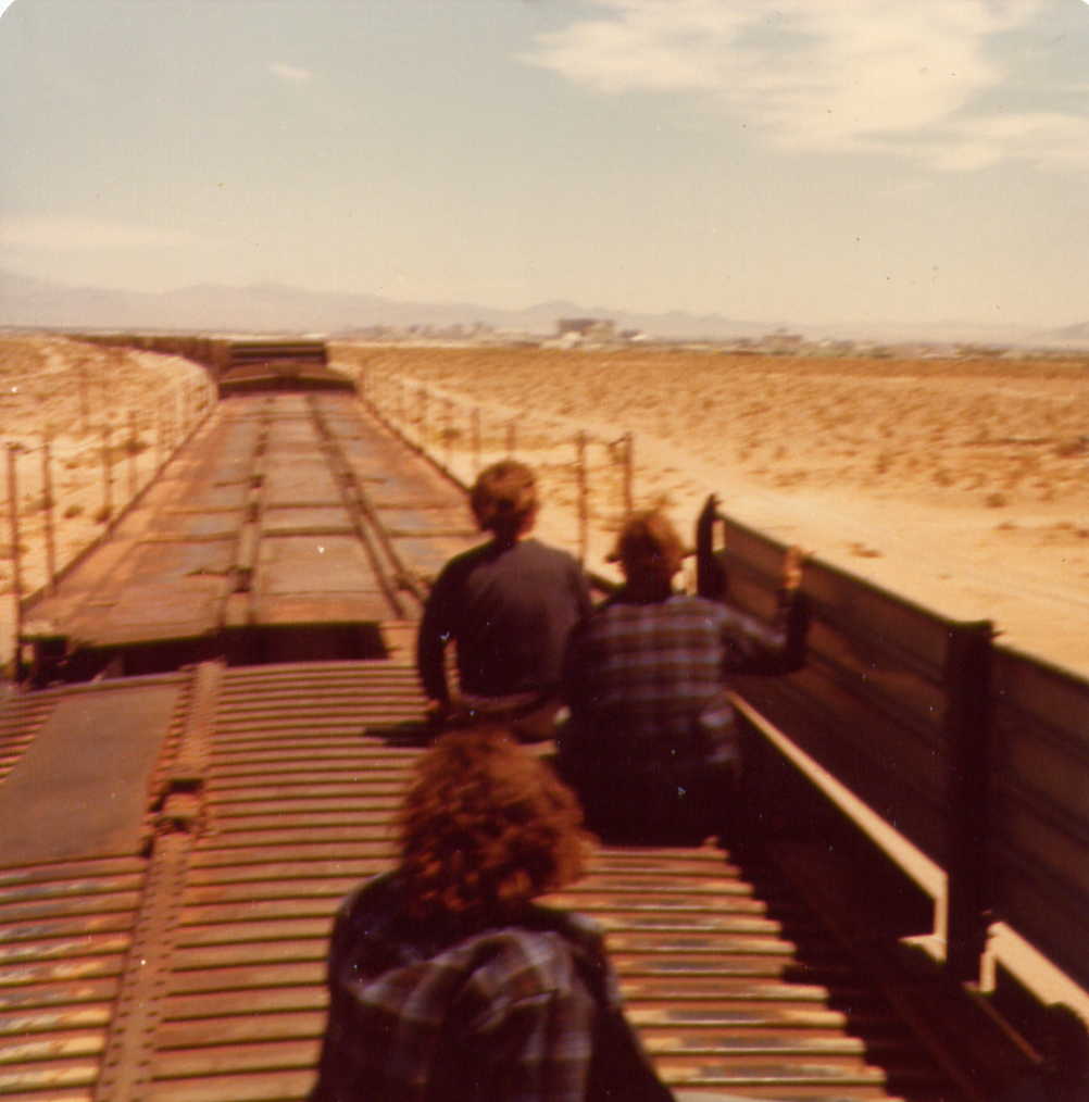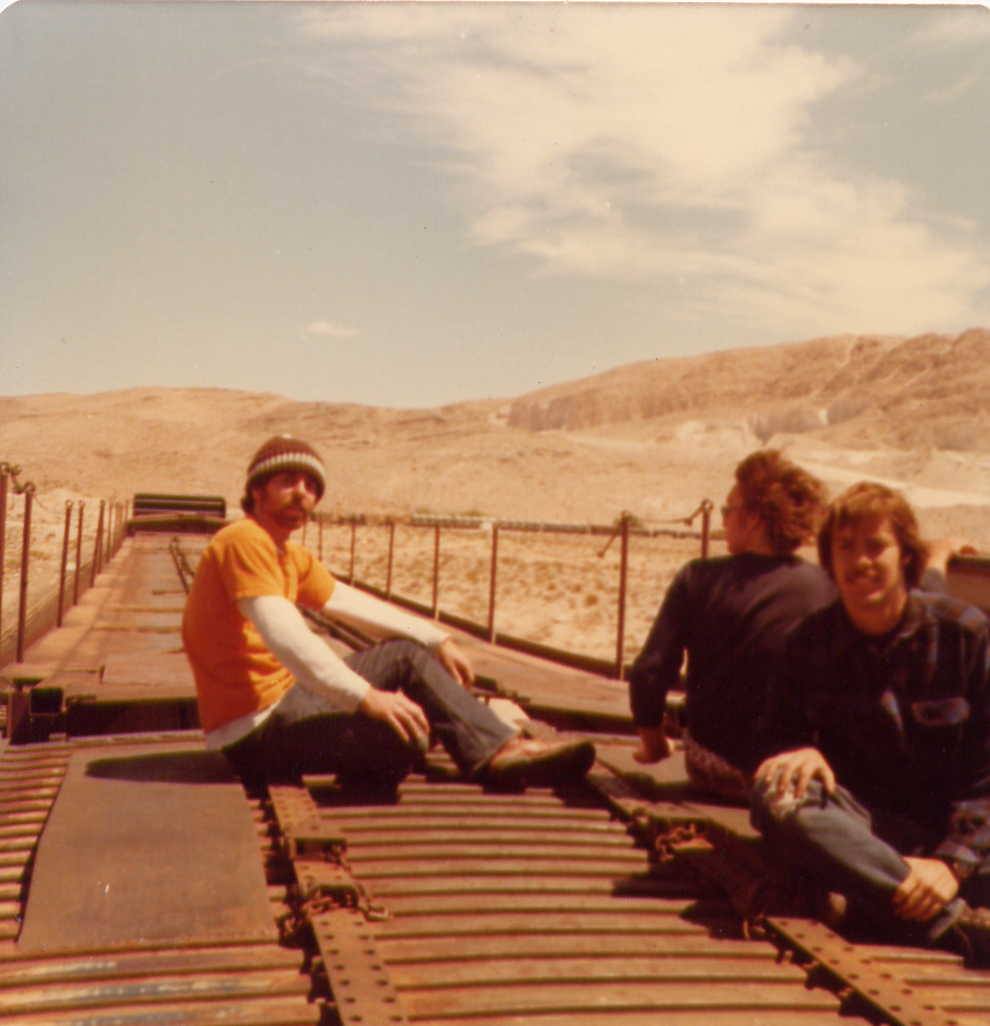 Enjoying a cold one while waiting on a siding in the Eastern California/Western Nevada Desert (June 1977)